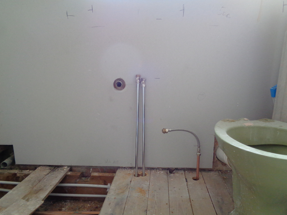 Basin hot and cold water feeds comming from under the floor