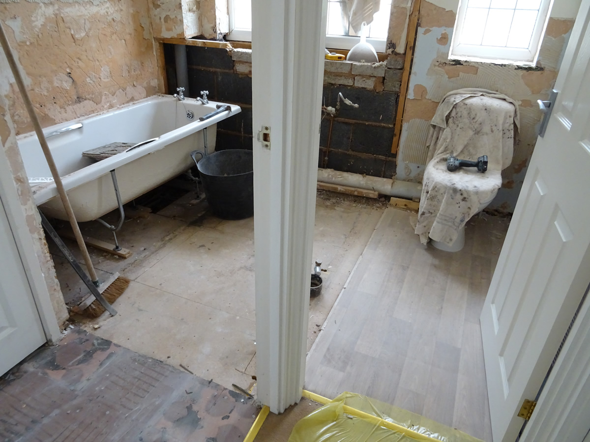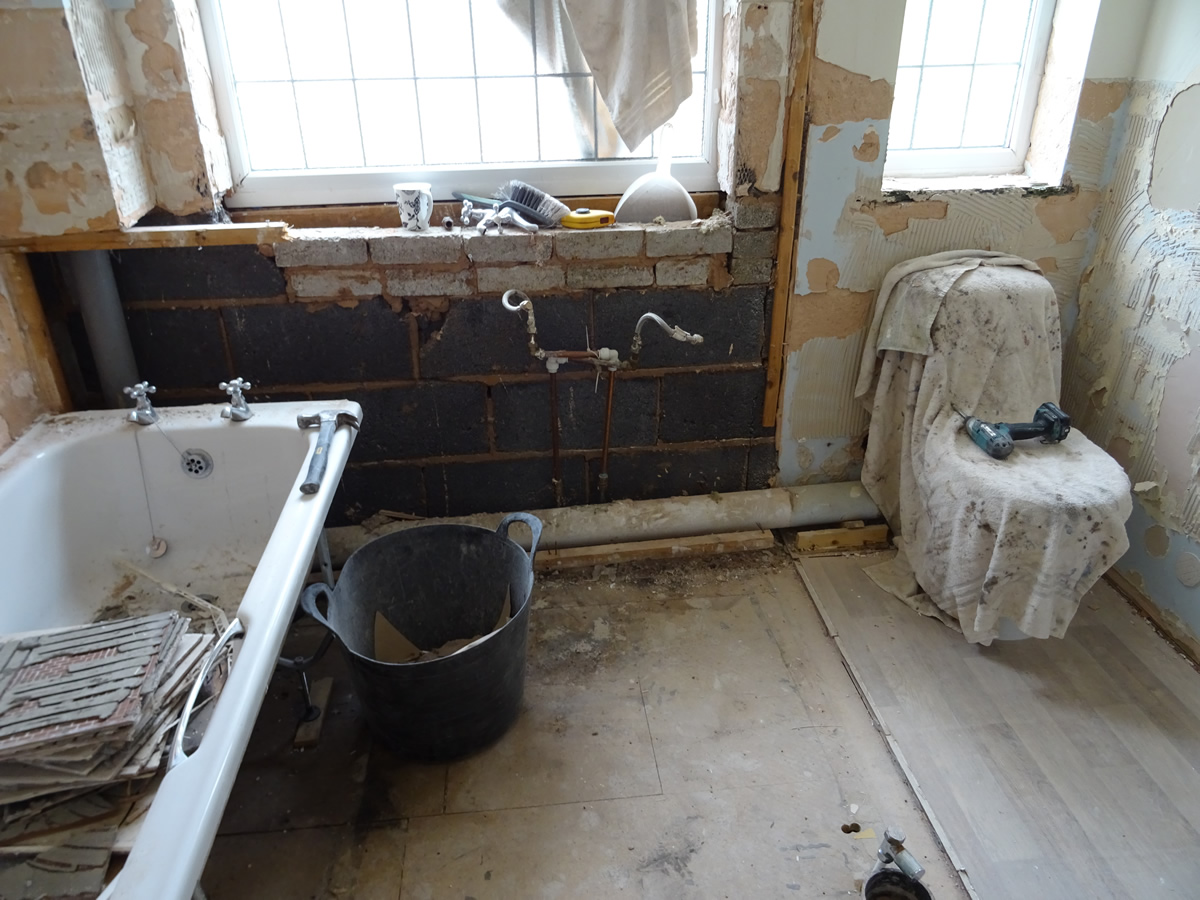 Originally there were two door entrances, one into the bathroom the second door for the toilet. The three images below show the two door areas before the work began, the same area after the bathroom and toilet dividing wall was removed, and finally when the bathroom was complete and the the toilet door closed and plastered.