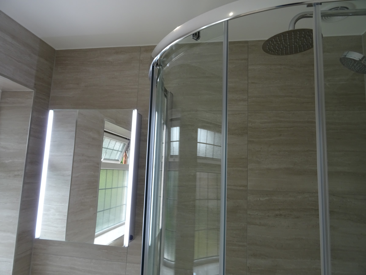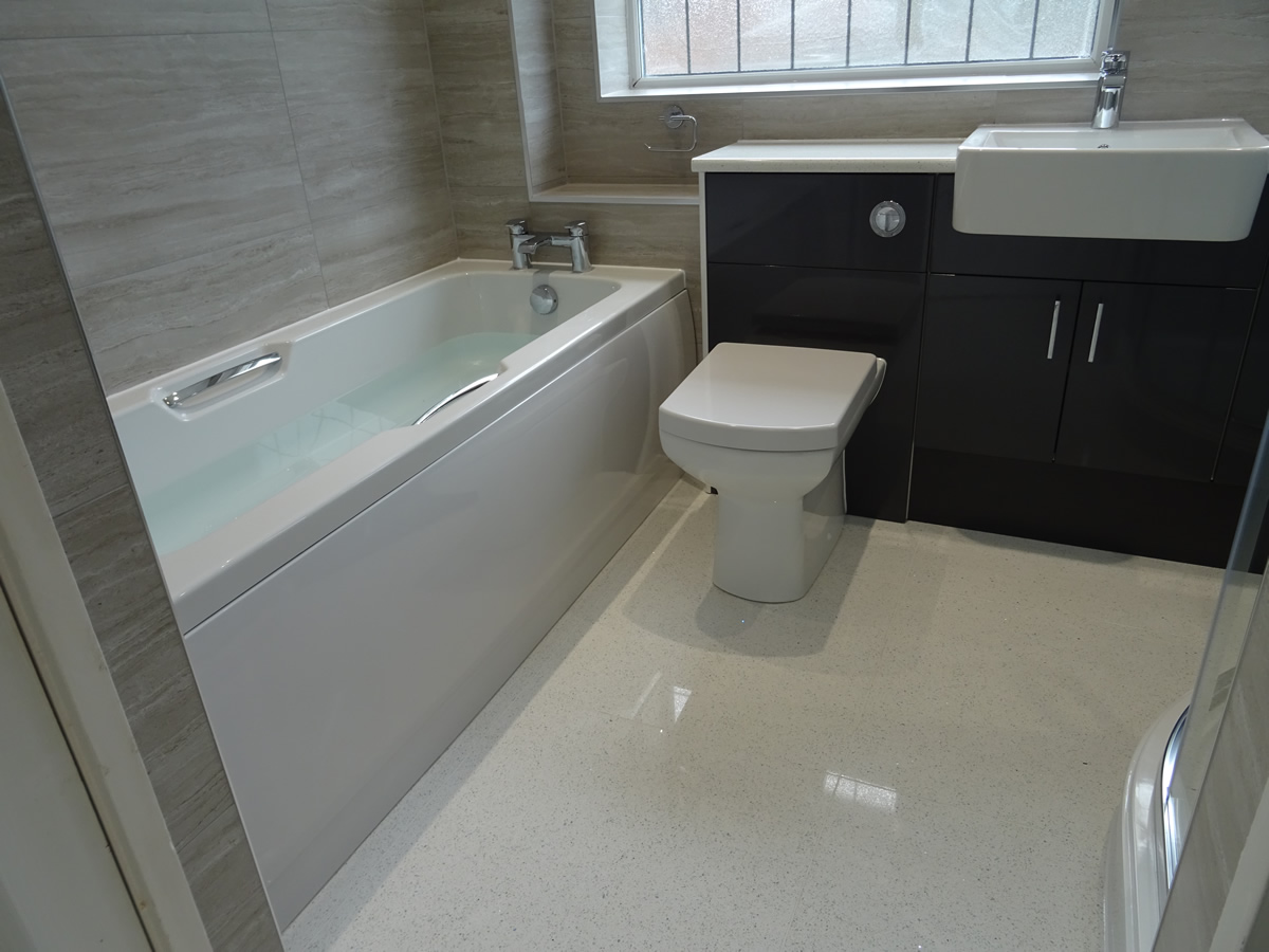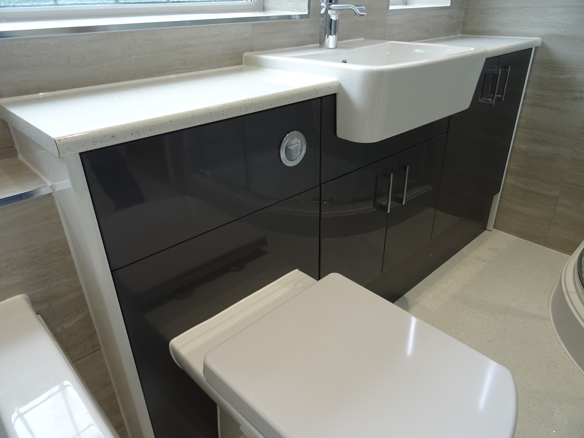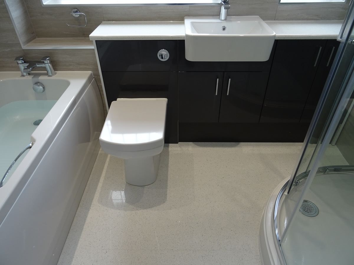 Removing the dividing wall between the bathroom and toilet created a much larger bathroom measuring 258cm wide and 270cm long. This space now allows for a bath, separate shower enclosure and a wall of fitted bathroom storage furniture. Below are the two bathroom designs. The original design and the new design.