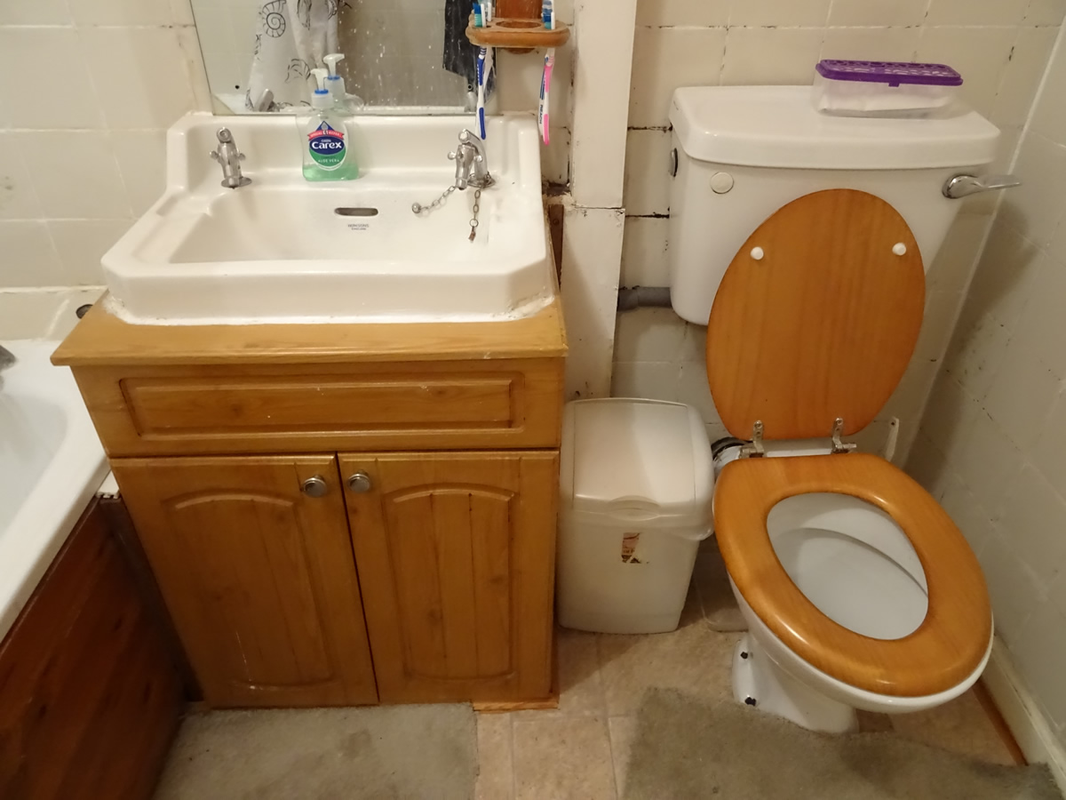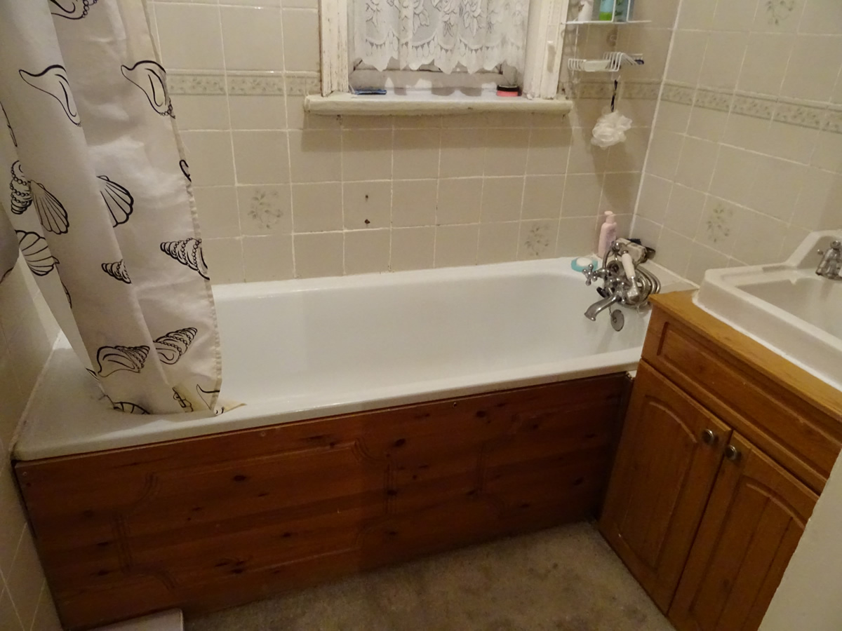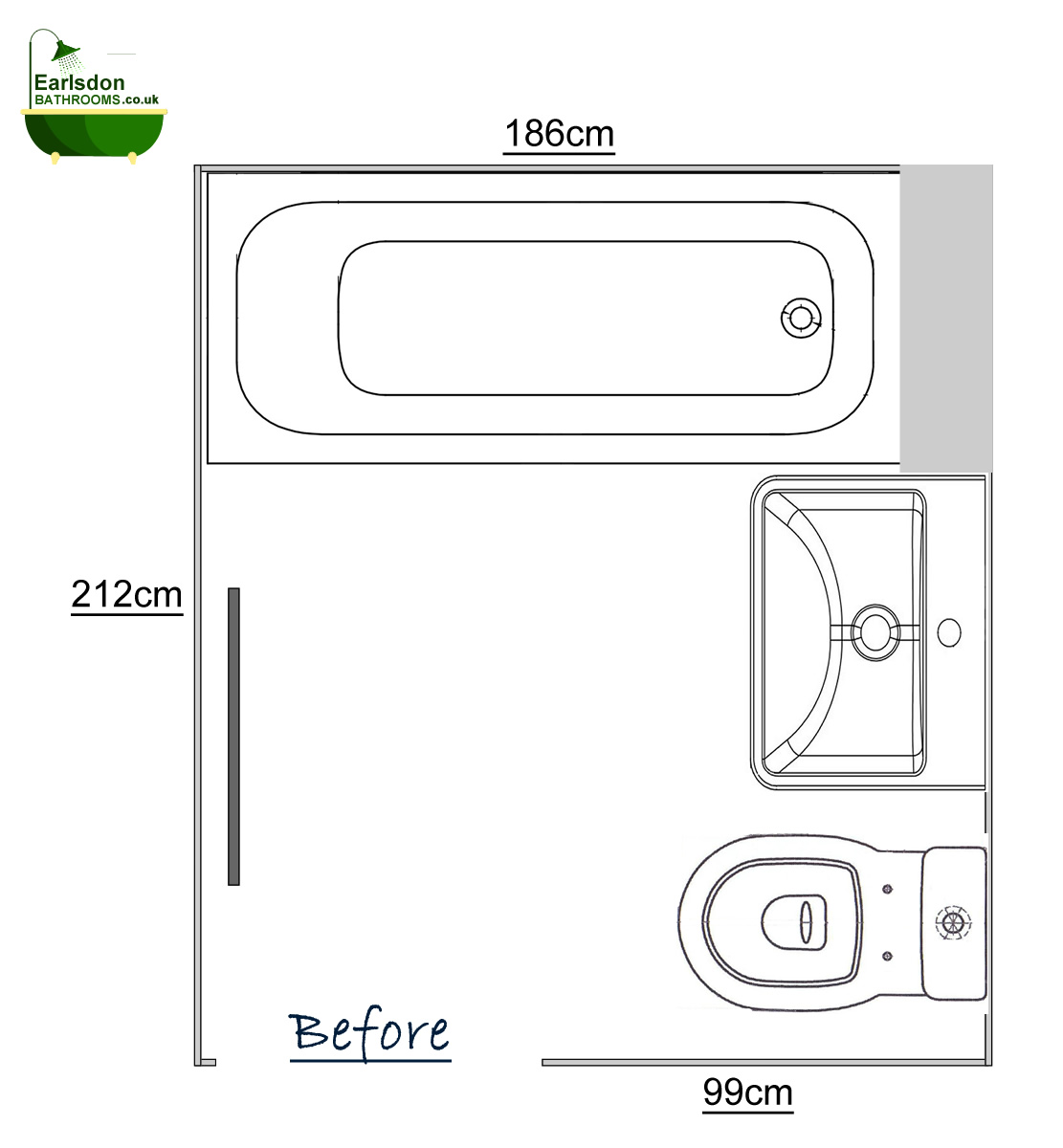 This is a bathroom renovation that we carried out on Wainbody Avenue South Coventry. The bathroom size is 186cm by 212cm long. The original layout of the bathroom has the bath situated in the wrong location. The bath is 170cm long, the area the bath is placed is 186cm leaving a gap of 16cm. The bath was originally fitted with the gap at the tap end that resulted with water sitting on the shelf at the end of the bath. Below is the drawing of the original bathroom design