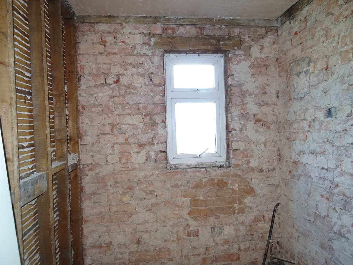 When we began the bathroom renovation, we removed the original bathroom products and tiles. We then removed the plaster fro the brick walls.. Two of the internal walls are made of lath and plaster, removed the lath and plaster exposing the studded wall structure. Below are the images of the bathroom space after all products were removed.