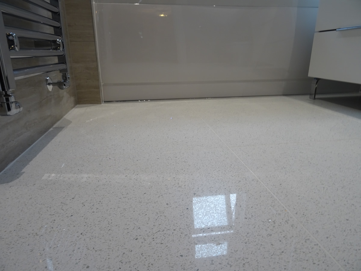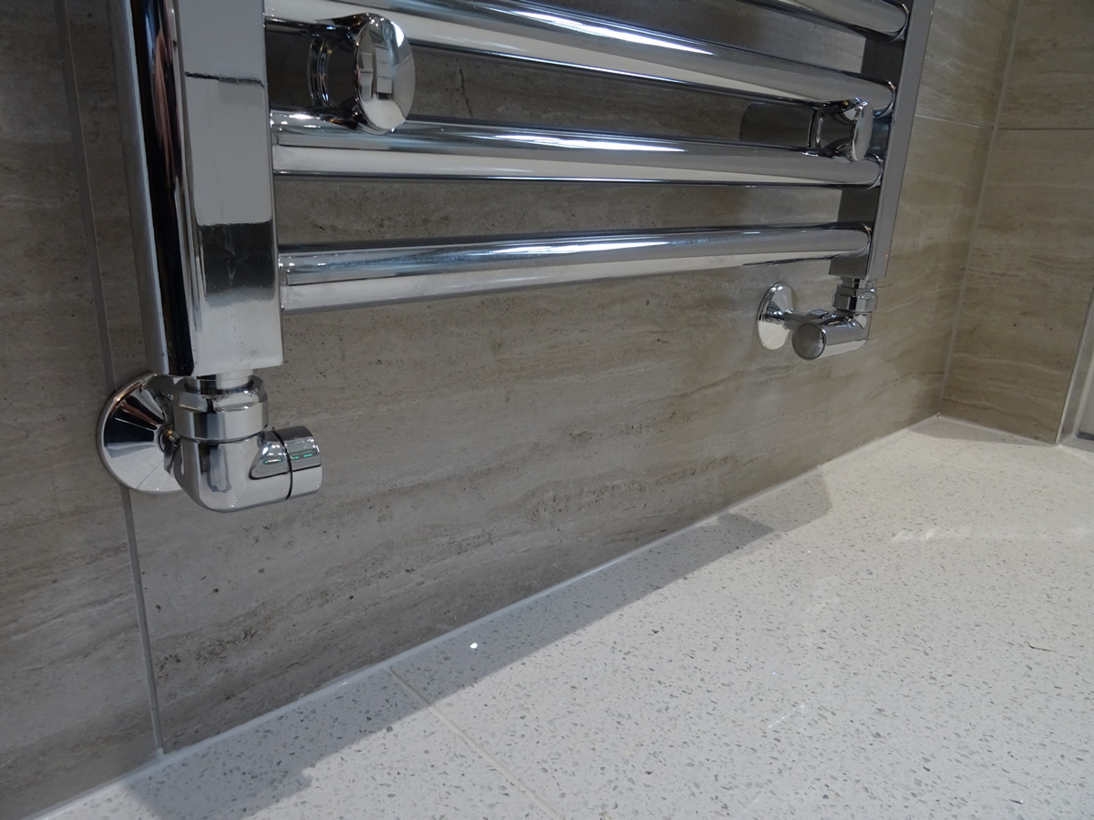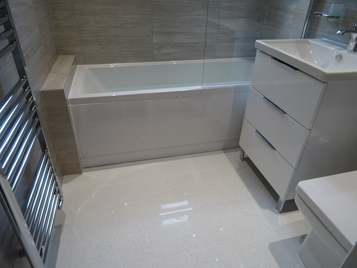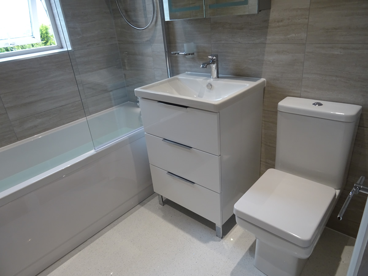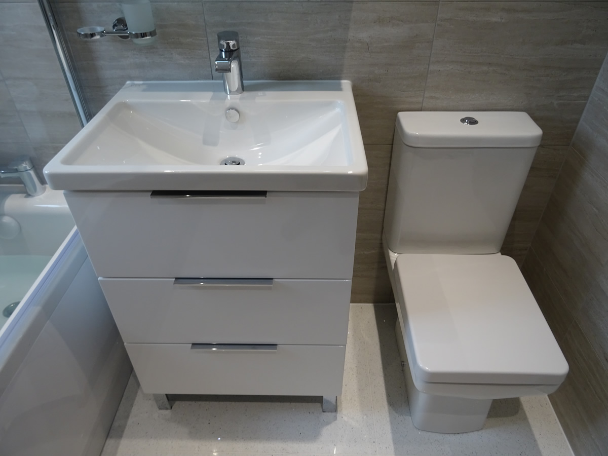 The new bathroom design places the bathroom with the tap end of the bath against the wall, leaving the void at the end of the bath. This will help keep the area water tight. We also suggested a slightly smaller vanity basin allowing for a space between the bath and basin, and the basin and the toilet. Below is the new bathroom design that we finally fitted